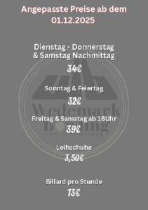 | Freitag & Samstag bis 18:00 Uhr | 34,00€ pro Bahn/Std. | bis max. 6 Pers./Bahn |